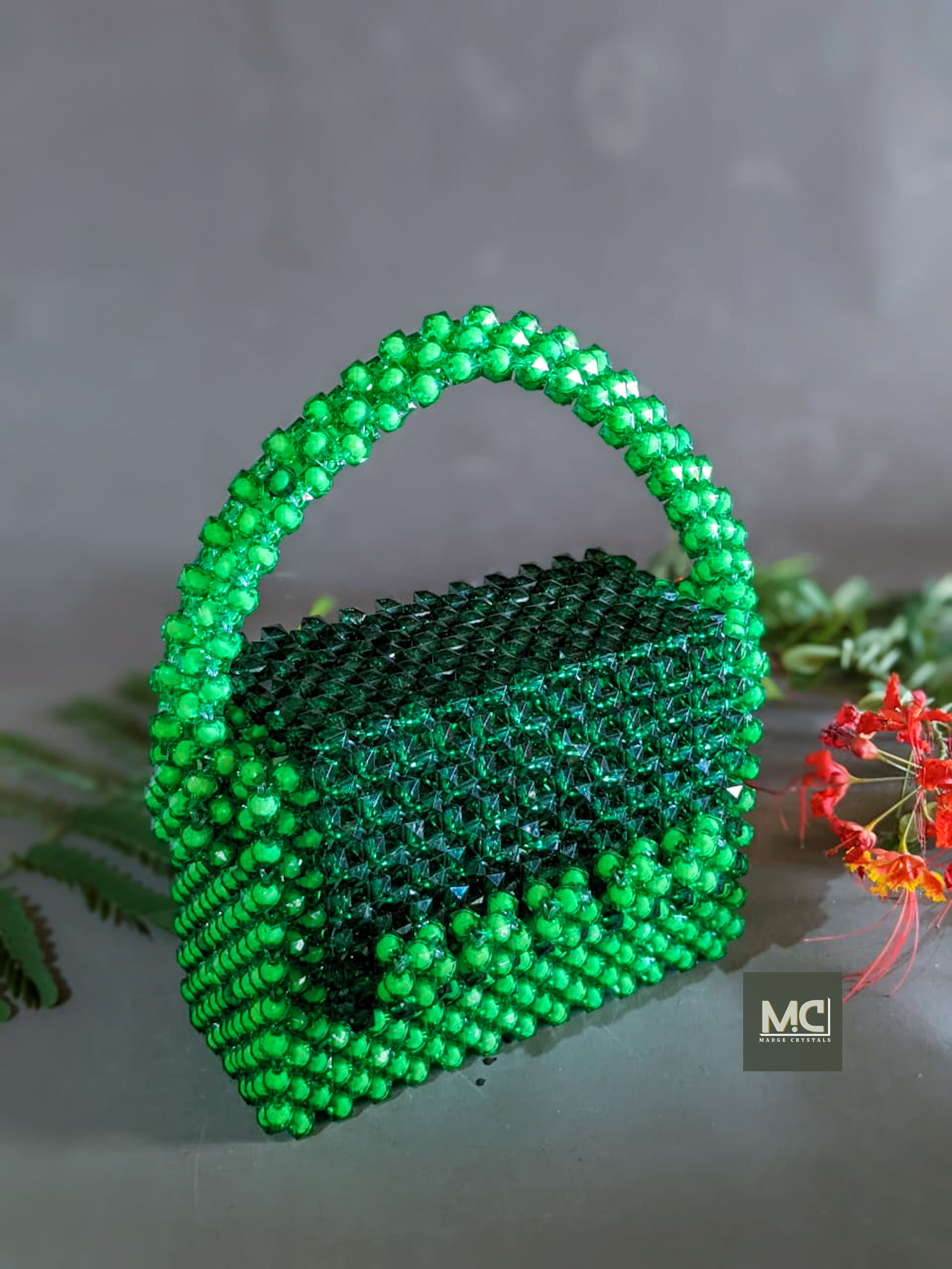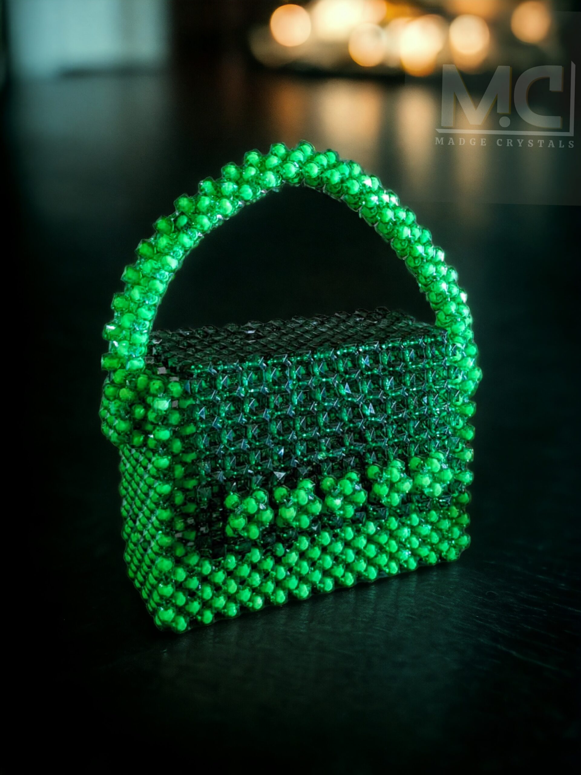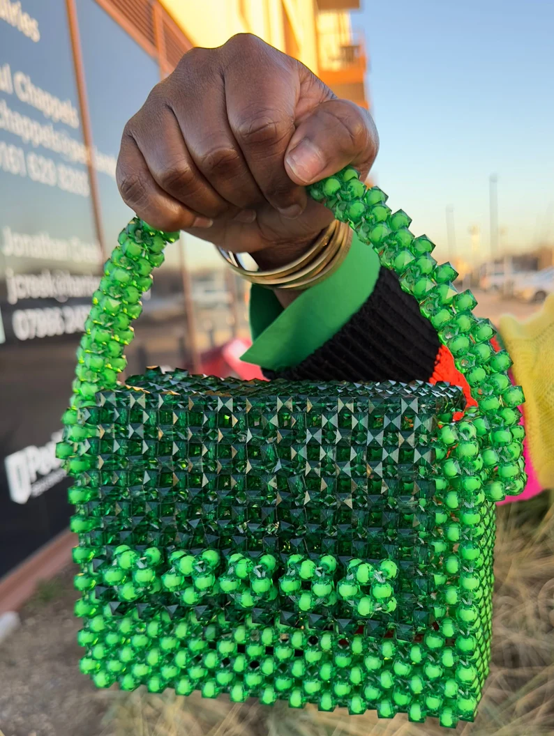 This elegant green beaded bag is a stunning accessory that adds a touch of glamour to any outfit. The compact design is perfect for evening outings, featuring a secure clasp closure and a soft inner lining to protect your essentials. This beaded bag is a stylish statement piece that complements both casual and formal look.